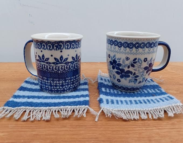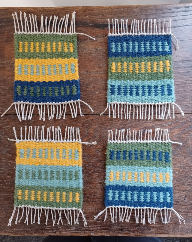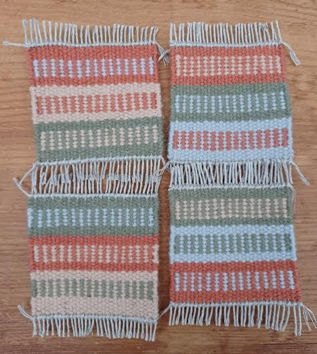 Handwoven mug rugs, made from linen and British wool, which is naturally water-repellent.